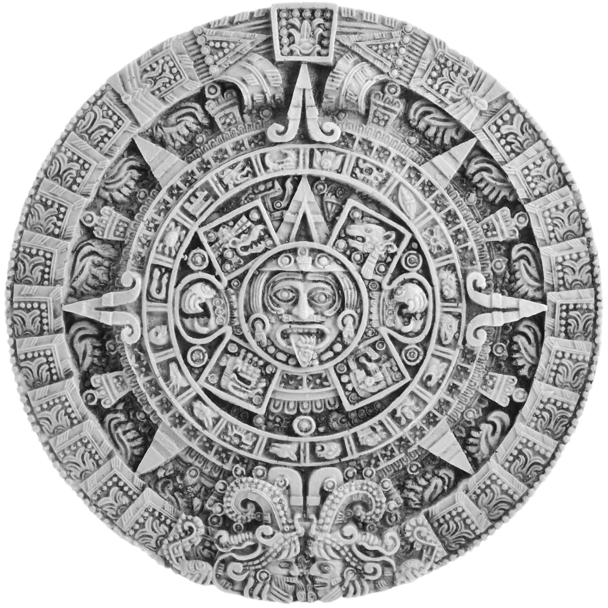 Nach Vorstellung der Maya und Azteken hat Gott die Welt bereits vier mal erschaffen und wieder vernichtet, da er mit seinem Ergebnis nicht zufrieden war. Diese vier Weltzeitalter sehen wir auf der Sonnenscheibe um das Gesicht herum angeordnet. Sie werden immer in folgender Reihenfolge genannt: Jaguar, Vogel (Wind), Affe (Regen), Fisch (Wasser). Mir fiel auf, dass es sich hierbei um die Evolutionsabfolge handelt, allerdings in der falschen Reihenfolge. Richtiger wäre: Fisch, Vogel, Affe, Jaguar. Jaguar bedeutet im Lateinischen fleischfressender Vierfüßler, womit auch wir Menschen gemeint sind. Diese vier Zeitalter wurden jeweils durch Erdbeben, Feuer, Überschwemmungen und Sturm, somit durch die vier Elemente Erde, Feuer, Wasser, Luft vernichtet.